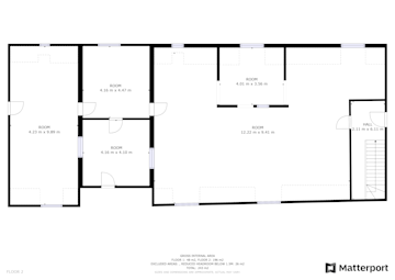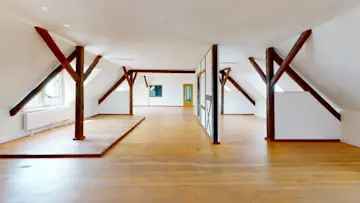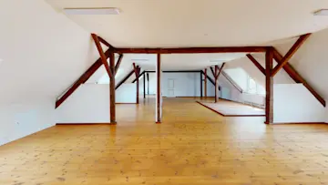 Über eine Treppe gelangen Sie in das 1. Obergeschoss, das 196 Quadratmeter umfasst. Hier finden Sie vier Räume vor, wobei der größte Raum mit sichtbaren Holzbalken ein echter Hingucker ist. Das Obergeschoss kann nach Ihren individuellen Wünschen umgebaut werden, um die Fläche optimal an Ihre Bedürfnisse anzupassen.