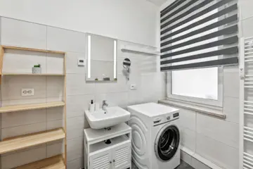 Ein frisch saniertes Tageslichtbad mit Dusche und Waschmaschine komplettiert unser schickes Apartment, geeignet für Urlaubs- und Geschäftsreisende. Auch ein persönlicher Parkplatz im Innenhof gehört zu diesem Apartment.