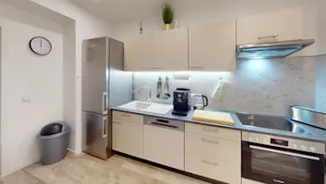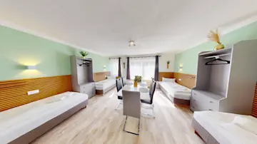 Unser Apartment wurde Ende 2024 hochwertig saniert und praktisch eingerichtet. Du findest auf 54 qm² zwei Zimmer mit gemütlichen Einzelbetten in Hotel Qualität. Im großen Schlafzimmer stehen vier Einzelbetten und ein großer Tisch, sowie Schubladen und Garderoben zu Verfügung. Im kleinen Schlafzimmer stehen zwei Einzelbetten zur Verfügung. An jedem Bett gibt es eine separate Lichtquelle und eine Steckdose mit USB- Lademöglichkeiten. In beiden Schlafräumen ist jeweils ein großer Flachbildfernseher vorhanden. Unsere Küche ist modern ausgestattet, du findest alles was du zum Kochen und Schlemmen benötigst. Der Kaffeevollautomat lässt keine Kaffee Wünsche offen. Dein Wasser bereitest du dir in unserem Soda Stream ob Medium oder Spritzig, du wirst ganz sicher fündig.