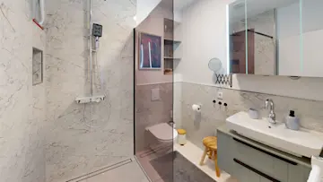 Das Bad verfügte über eine große ebenerdige Dusche und modernster Ausstattung.